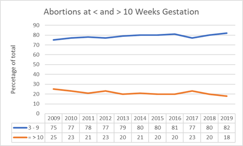 Over many years, there has been a slow, steady increase in the proportion of abortions which occur at lower gestational age. The percentage of abortions at <10 weeks in 2009 was 75% and this had risen to 82% by 2019.