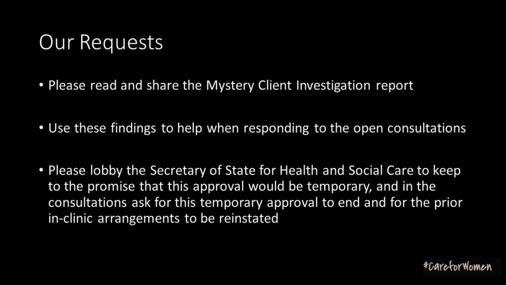 We think that doing so would be a mistake, resulting in continued degradation of care for women and so we are asking that you consider the evidence and respond to the government asking for the temporary approval to cease and for a return to the prior arrangements of in-clinic assessments before a woman is prescribed the abortion pills.