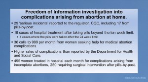 - Data from a freedom of information (FOI) request to the Care Quality Commission (CQC) show that it investigated 29 serious incidents where women who had accessed early medical abortion (EMA) had suffered complications; 17 of these women had accessed the pills-by-post process, in which the abortion treatment is posted to a woman after only a phone consultation.