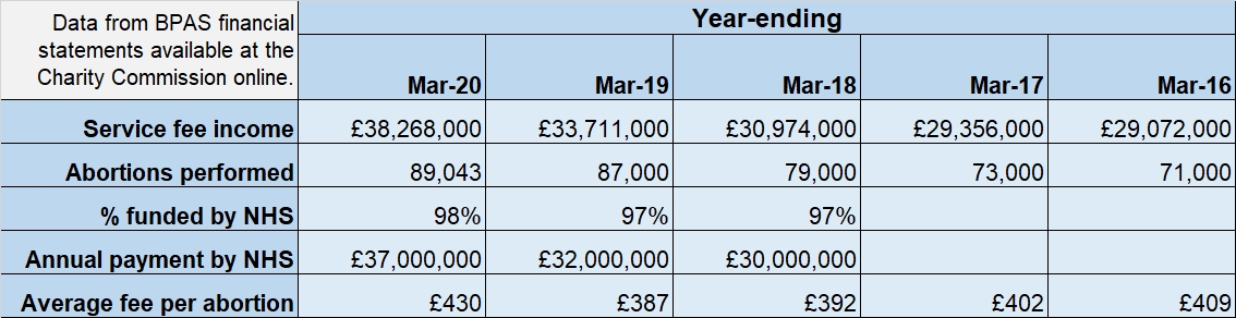 Based on data published in its 2020 financial statement,[1] BPAS was paid £37 million by the NHS, largely for its provision of abortion services; the average fee per abortion was approximately £425.