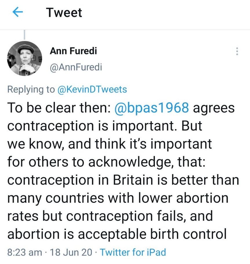 Ann Furedi has always been open and honest about this, as can be seen in this Twitter chat in June 2020. She and Cooke both consider abortion as acceptable birth control and a necessary service to make available when providing contraception.