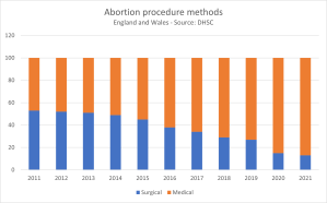 In 2011, 53% of all abortions in England and Wales were provided using surgical methods and 47% medical. Over the following ten years this balance shifted significantly towards medical, 87%.[i]