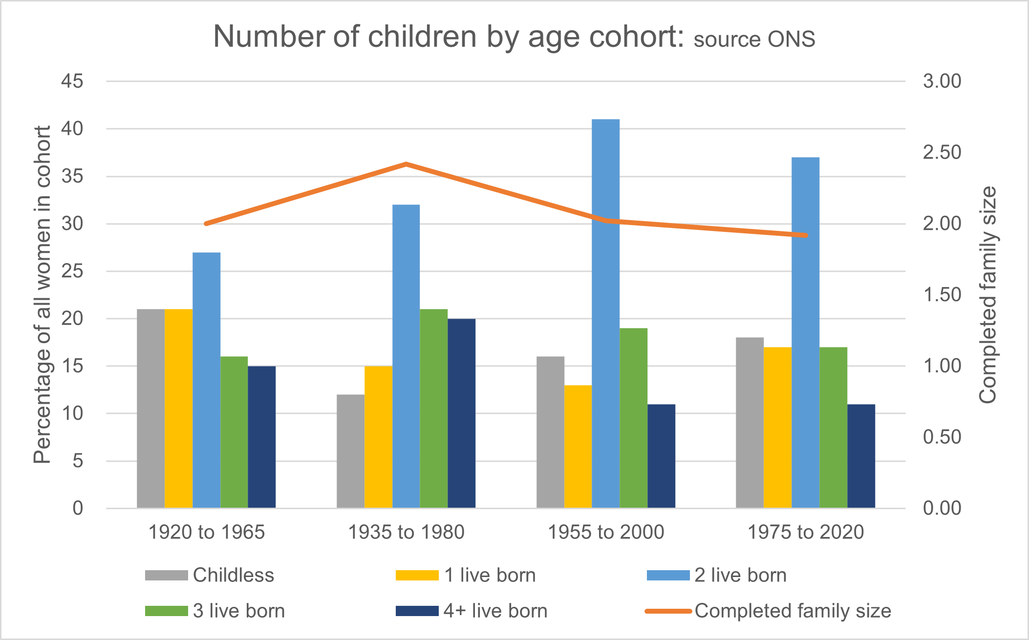 TFR is a snapshot in time, measuring the average fertility across all women aged 15-45 in any particular year, and it can be helpful when considering trends; an alternative measure is the completed family size (CFS), indicating the total number of children that a woman has had in her reproductive lifetime. The ONS provides data for CFS by age cohorts, as shown in this graph.