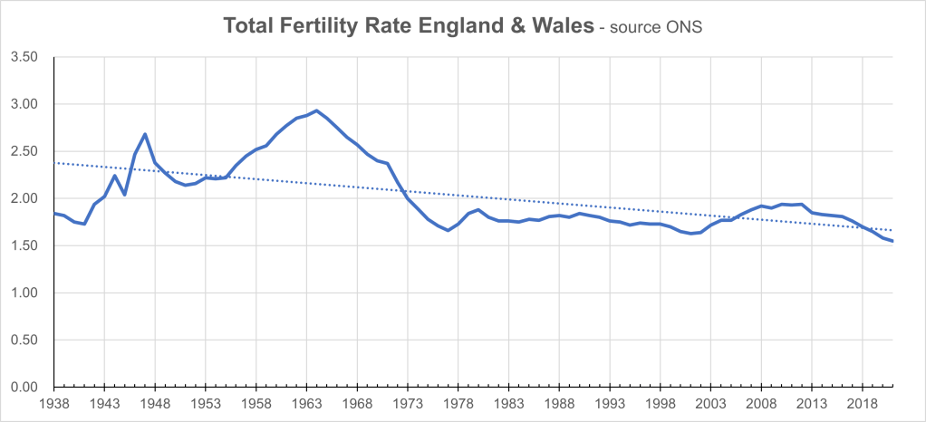 When modelling their “more children” scenario, Morland and Pilkington used an assumed TFR of 2.1 for 2023, rising slowly over the next sixty years to just over 3.0. They made no more than a polite nod towards acknowledging how challenging this might be. In the past eighty years, our TFR has never reached 3, it peaked at 2.85 in 1965, and is currently at a new low of just 1.55; there has been a steady downwards trend over these past eighty years.