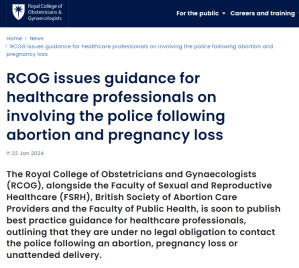 The RCOG guidance, “Involvement of the Police and External Agencies following Abortion, Pregnancy Loss and Unexpected Delivery”, was published on 25 January 2024; the PDF is here.