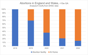 The most recent set of official data from the Office for Health Improvement & Disparities (OHID), part of the Department of Health and Social Care (DHSC), is for the first six months of 2022; the data for the full year should have been published in June 2023 but has been delayed until April 2024. The published data shows that in the first half of 2022, 88% of all abortions were performed at less than 10-weeks gestational age. In 2018, each one of these abortions would have been completed at an abortion facility. In the first half of 2022, 85% were self-managed by women in their own homes.[i]
