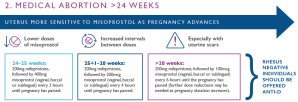 The RCOG warns abortion providers that the “uterus is more sensitive to misoprostol as pregnancy advances, and therefore, in pregnancies over 24-weeks, lower doses of misoprostol should be used and increased intervals between misoprostol doses should be considered, especially for women with uterine scars.” It states an initial dose of 400mcg of misoprostol, which is half the dosage used when gestational age is less than 12-weeks.