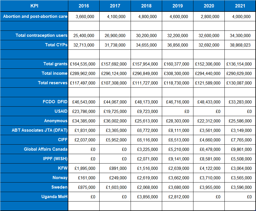 The table includes a sample of the many donors supporting MSI-RC; it shows the annual decline in funds received from USAID, a direct impact of MSI-RC refusing to sign its agreement to the Mexico City Policy. However, it is interesting to note how other governments stepped in to make up this gap, see e.g., new funds from Canada and from the WISH programme funded by the UK Government, significant increases from Germany (KFW), Norway and Sweden, and new monies from Uganda.
