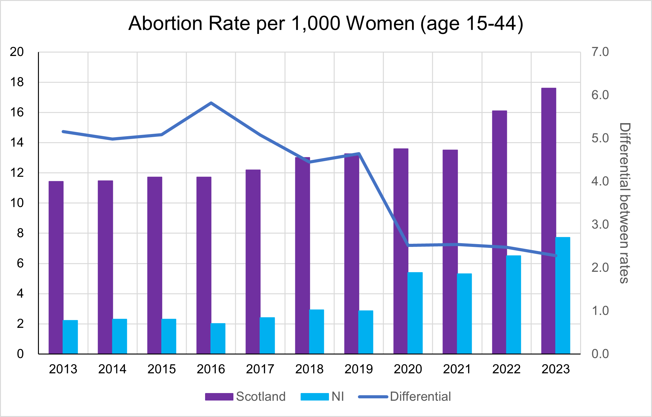 In 2013 the abortion rate per 1,000 women aged 15-44, was 2.2 in NI, less than one fifth of the rate of 11.4 in Scotland. Both Lives Matter and others have argued that culturally NI and Scotland are quite similar, and so this marked difference might indicate the impact of the abortion law in each country; up to 2020 NI’s being restrictive and Scotland’s being broadly permissive, similar to the one in England and Wales. We can see by 2023 this differential has more than halved; the rate in Scotland (17.6) is now just 2.3 times higher than the rate in NI (7.7), perhaps already showing the impact on societal behaviour of the permissive 2020 abortion law. It is also interesting to note on this graph the uptick in Scotland in 2022 that may be due to the increasing impact of abortion by telephone and pills-by-post, an abortion regulation that further normalises abortion, making it much easier to access.