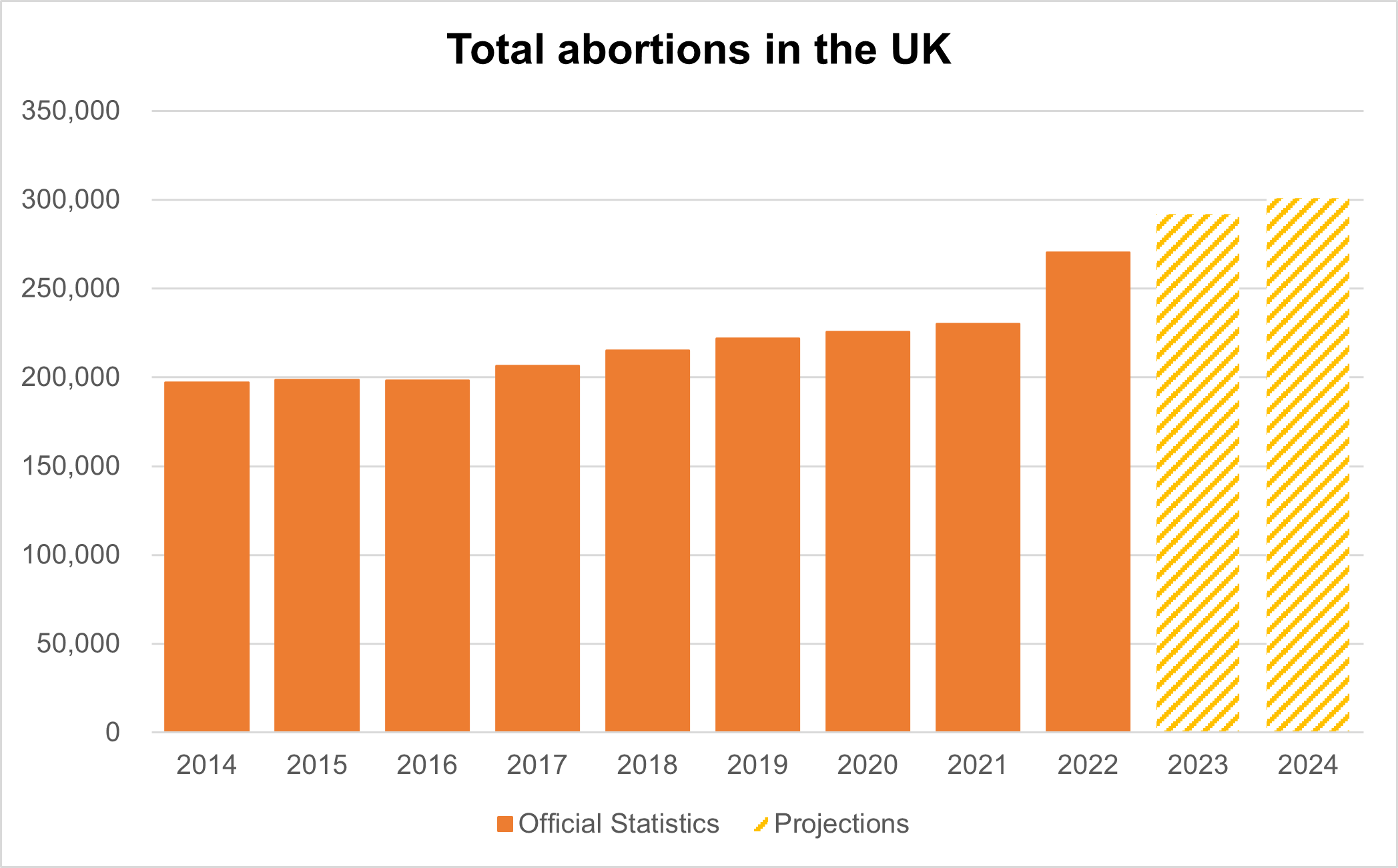 Data up to the end of 2022 are official and published. 2023 data have been published for Scotland, Northern Ireland, BPAS, and MSI-RC, constituting about 75% of all abortions in 2023, and so we can conservatively project the balance from NHS E&W based on these published year-on-year increases. The official 2022 total for the UK is 270,324 and our projection for 2023 is 292,000. It is reasonable to assume a continued small increase in 2024, needing just an additional 3% to bring the last year’s total to over 300,000.