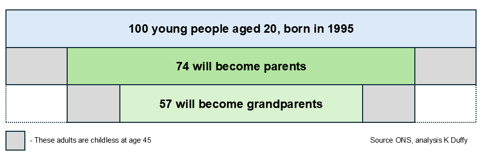 Analysing data for the most recent cohort of 100 young people aged 20, those born in 1995, we find the ONS projects that 74 of these will become parents, with an average of about 2.2 children per couple; 26 of their cohort will remain childless by age 45.