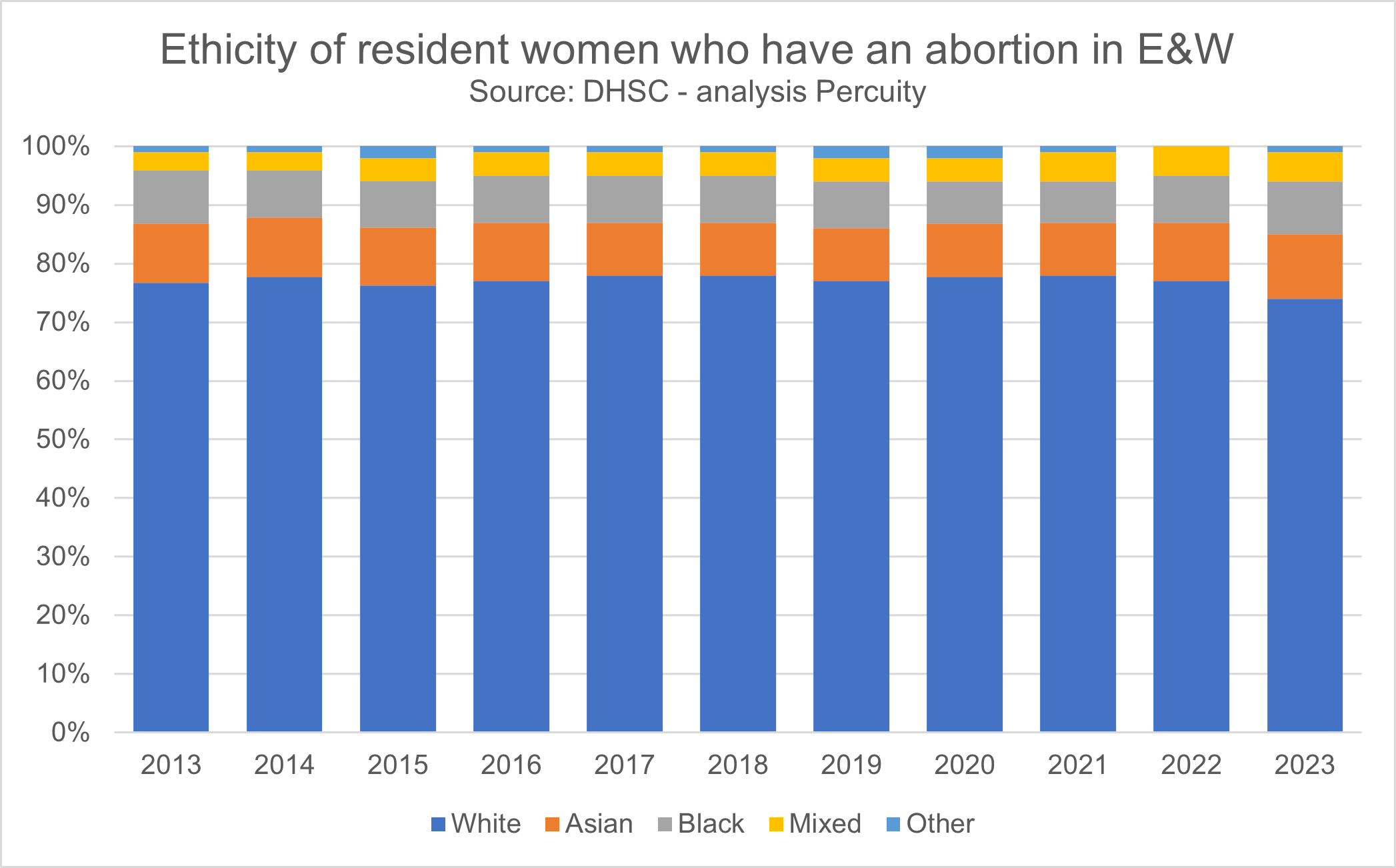 The chart below shows the DHSC ethnicity data for resident women having abortions in England and Wales from 2013 to 2023. Percentages exclude ‘not known’ and ‘not stated’, so the chart displays each of the five reported ethnicities as a share of the total.