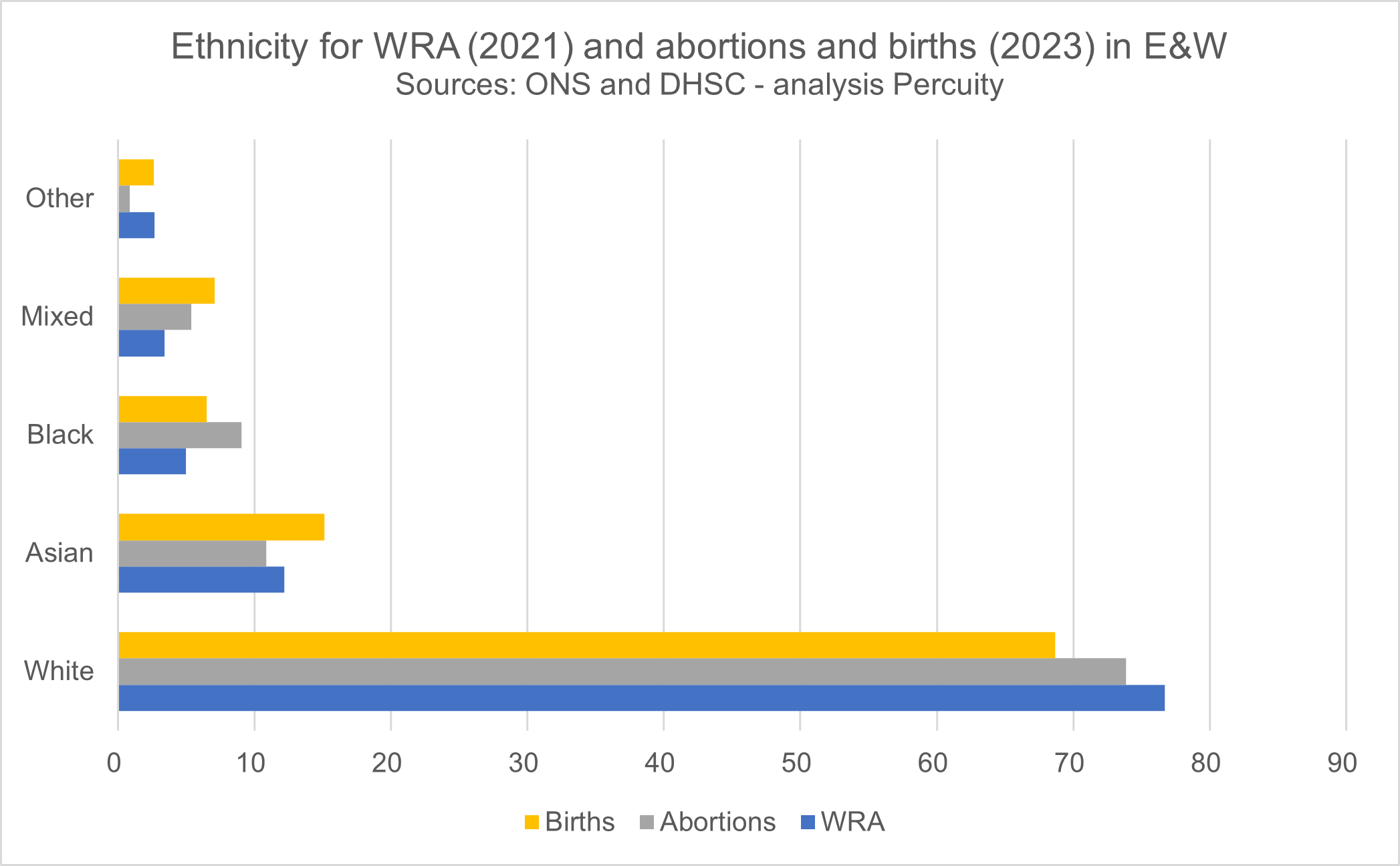 To place this in demographic context, the next chart compares the ethnic proportions of women of reproductive age (from the 2021 Census) with the proportions of women having abortions and women having live births in 2023.