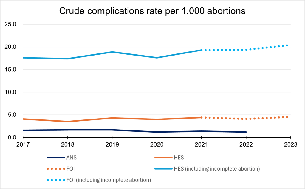 - The Office for Health Improvement & Disparities (part of the Department of Health and Social Care) published a one-off report in November 2023 using data from the Hospital Episode Statistics that showed an abortion complications rate of 18.2 per 1,000, twelve times more than that previously reported by abortion providers in the Abortion Notification System.