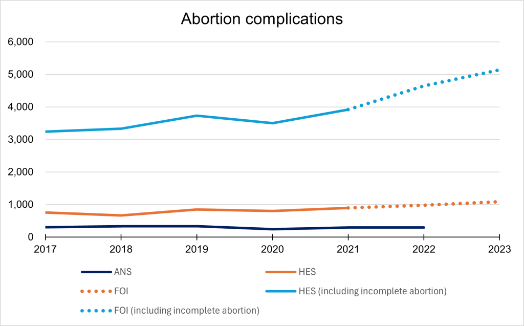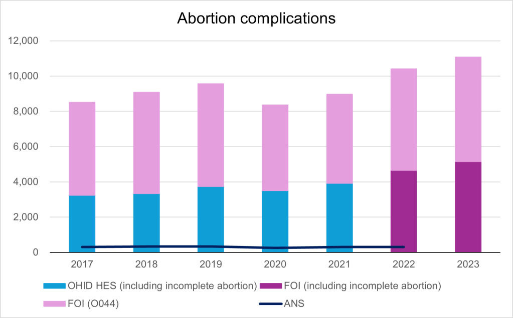 - In 2022, the official statutory reporting by the abortion providers (ANS), stated just 300 women with abortion complications, about 3% of the 10,409 reported by NHS hospitals.