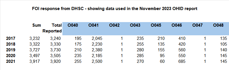 The FOI request included O044; the total number of cases coded with O044 over the seven years 2017-23, was reported in the FOI responses as 38,464. This compares with a total of 27,577 from all of the codes O040-43 and O045-48; so, there are 1.4 times as many women treated for abortion complications coded as O044, as there are in all of the other codes used in the OHID report.