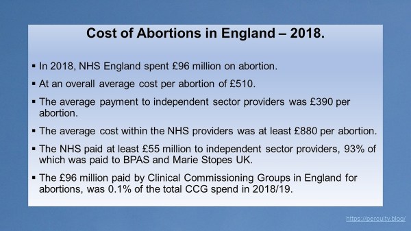 Cost of Abortions in England 2018Download Freedom of information responses show that in 2018, NHS England paid £96 million for abortion services, at an overall average cost of £510 per abortion. From BPAS published financial statements[1] and a number of FOI responses, we can derive that the average price charged to the NHS by the... Continue Reading →