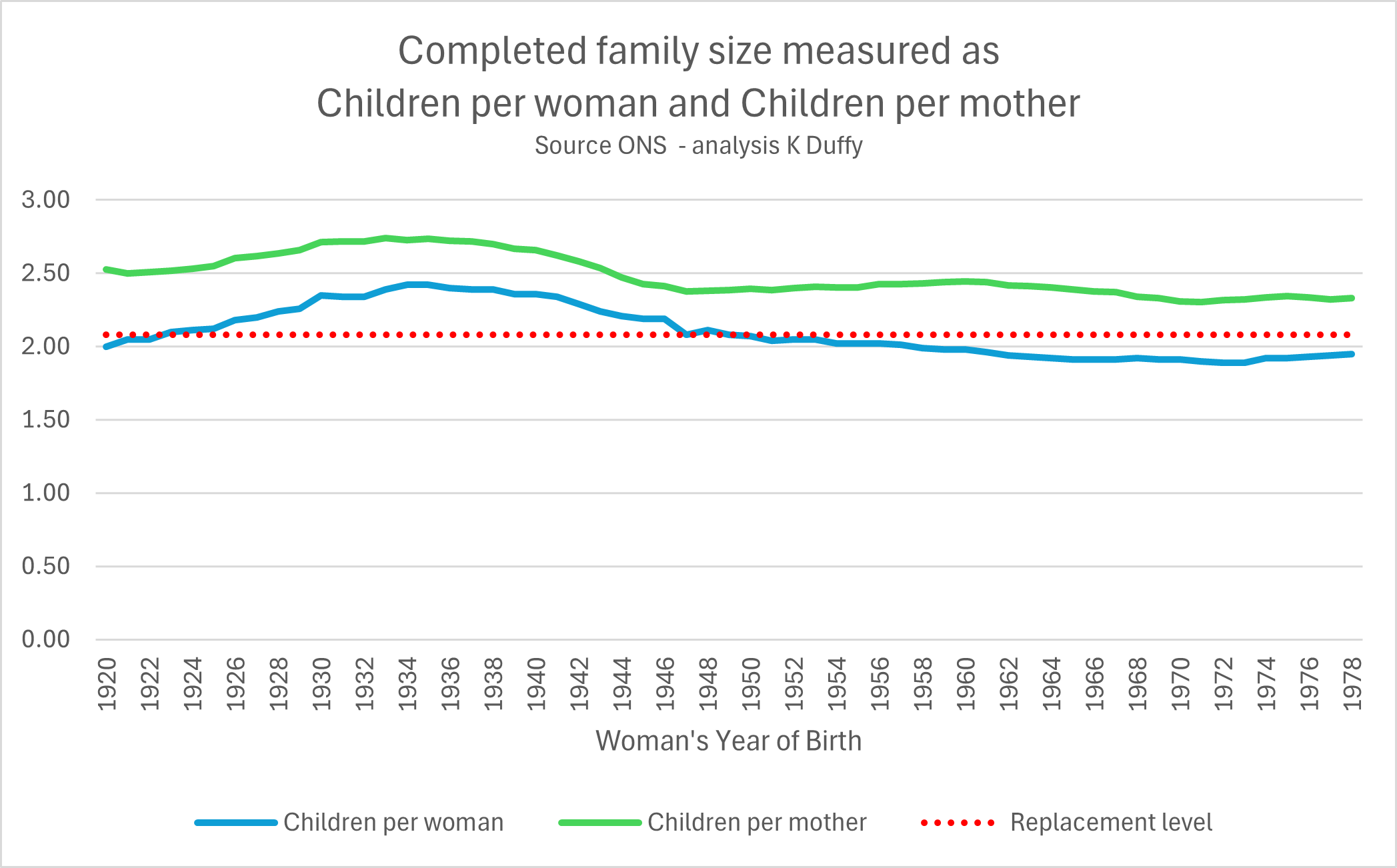 The latest set of fertility data for cohorts of women reaching age 45, was published by the ONS in April 2025; the most recent cohort is the one of women born in the year 1978, reaching age 45 in 2023.[8] This report shows the completed family size (CFS) for that 1978 cohort was an average of 1.95 children for all women. Further analysis shows that the children per mother (CPM) was an average of 2.33 and the total maternal rate (TMR) was 0.84, in other words 16% of women in that cohort remained childless at age 45.