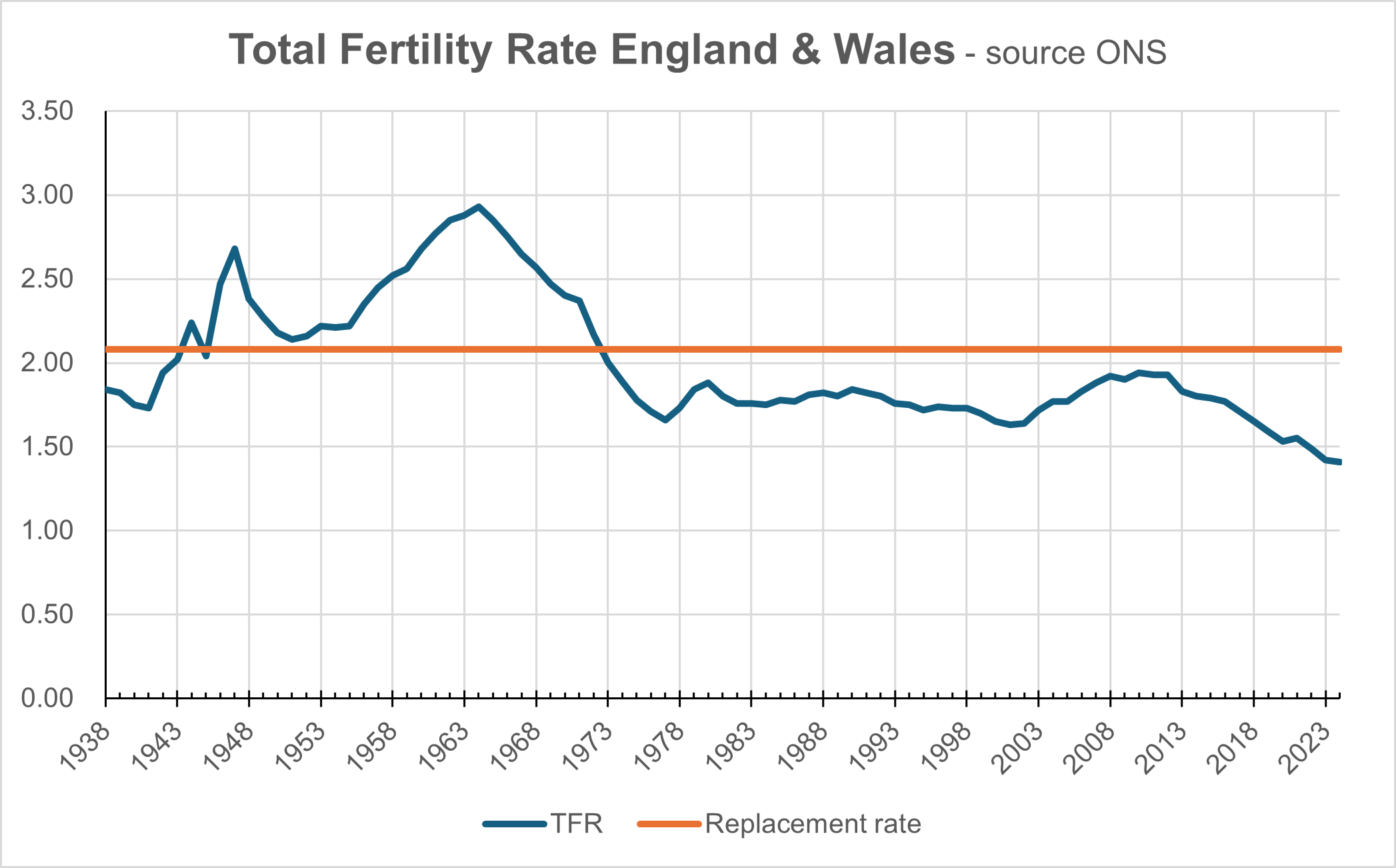 In August 2025, the Office for National Statistics (ONS) announced for England and Wales that the total fertility rate (TFR) in 2023 was 1.41, “the lowest value on record for the 3rd year in a row.” [2] [3] The ONS principal projection for TFR in 2027 is 1.41, rising slightly to 1.45 in 2047.[4]